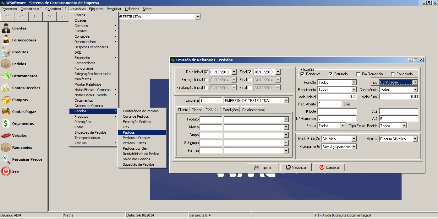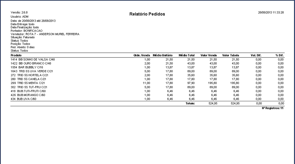 Portanto, não é possível comparar o relatório de bonificações, com o relatório de Pedidos do tipo Bonificação. Os dois fazem consultas diferentes e por isso, trazem resultados diferentes.