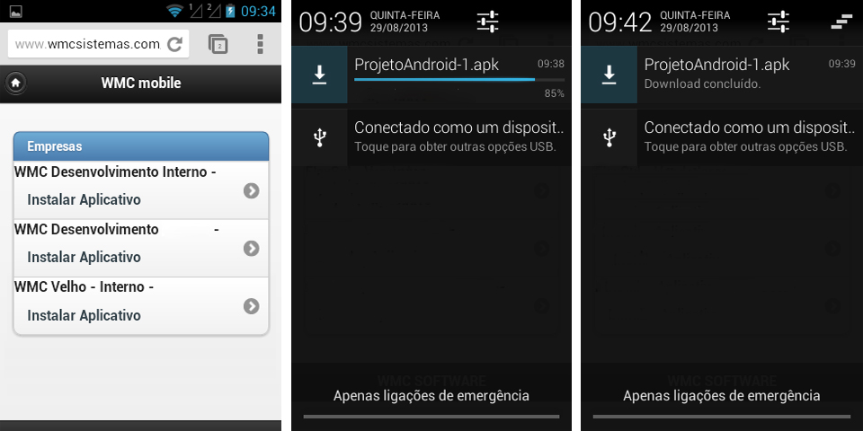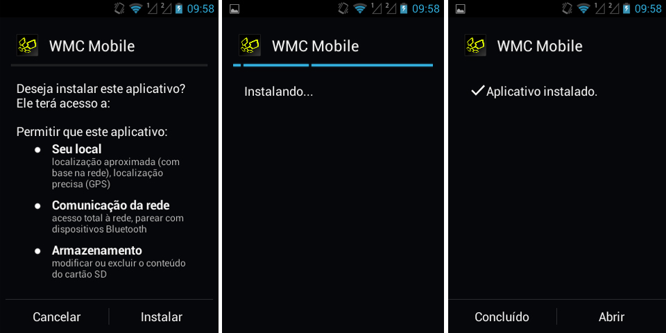 5) Para iniciar o processo de instalação do software WMC Mobile basta pressionar o botão “ProjetoAndroid.apk download concluído“. Após clicar em > Instalar >