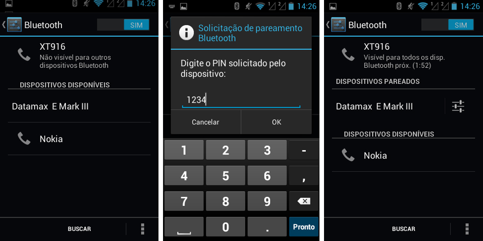 Impressora Bluetooth (selecionar impressora): – Em Caso de “PRONTA ENTREGA” é necessário configurar a impressora BlueTooth. Na mesma tela de configuração do vendedor existe o botão “Selecionar Impressora”. Este recurso vai ligar o BlueTooth (se ele não estiver ligado) e fará a busca automática para localizar as impressoras dentro do alcance do BlueTooth. Após encontrar o dispositivo certo, basta clicar no nome da impressora certa para a ocasião: