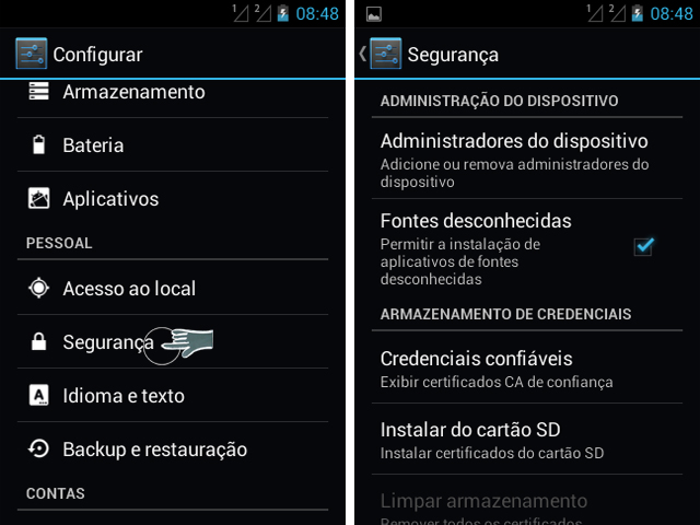 Neste submenu encontre a opção “Fontes Desconhecidas” (Unknown Sources) – Exatamente a que precisamos. Basta marcar para que esta alternativa seja válida e a nova configuração esteja pronta.