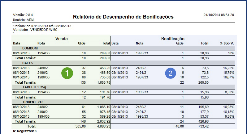 O relatório (que neste caso foi agrupado por produto) mostra na coluna “1 – venda“: A data em que foi lançada a Bonificação; O Nº-NF para buscar a nota em caso de dúvida; A quantidade vendida daquele produto; o valor total da venda, em valor (R$).
